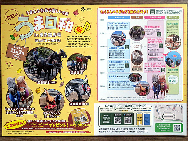 今日は東京競馬場でファミリー向けイベント「今日はうま日和♪」を開催。昨年に続き、今年2回目となります。 開放エリアは乗馬センター、日吉が丘、JRA競馬博物館の東門周辺のみで、今回も何台かのキッチンカーが出店していました。