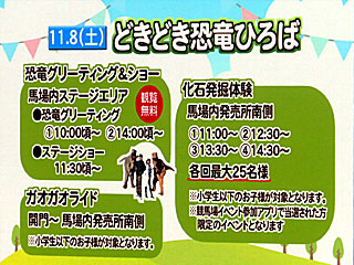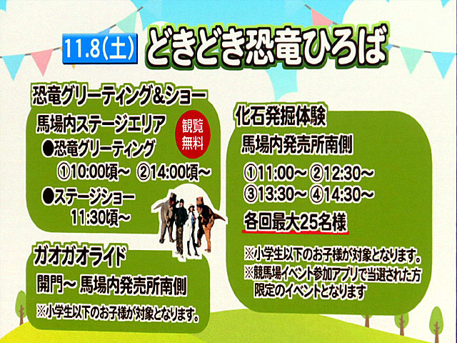 そして今日は子供向けの「どきどき恐竜ひろば」というイベントも実施されていました。内馬場に「ガオガオライド」や「化石発掘体験」のブースが設置され、ステージエリアでは「恐竜ショー」を行われていました。 競馬場で恐竜イベントというのは珍しい気がする…