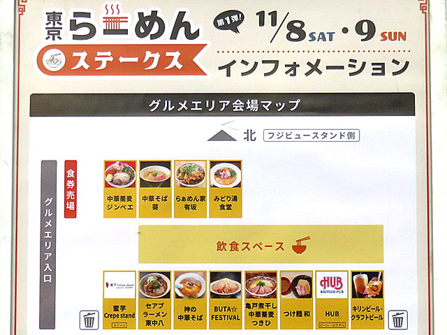 今開催のグルメイベントは「東京らーめんステークス2025」。2023年から3年連続での開催となります。 本日出店していたのは以下の通り。 「東中八」:食べログ 「神の中華そば」:食べログ 「BUTA☆FESTIVAL」:食べログ 「つきひ」:食べログ 「和」:食べログ 「みどり湯食堂」:食べログ 「有坂」:食べログ 「葵」:食べログ 「ジンベエ」:食べログ
