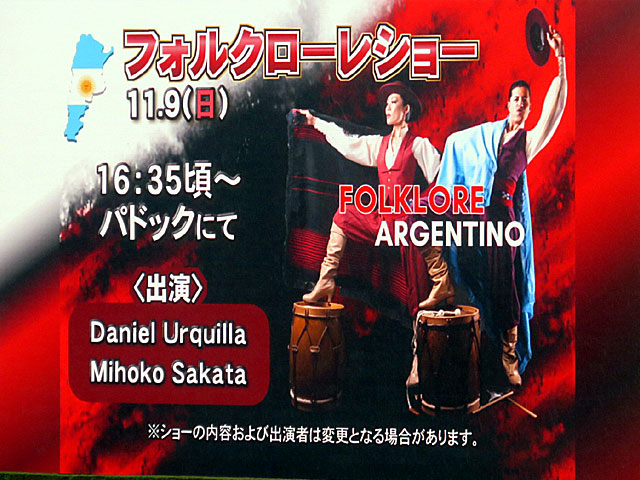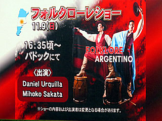 最終レース終了後、 例年なら「 アルゼンチンタンゴショー」が行われていましたが、今年は「 フォルクローレショー」が行われました。 昔、 フォルクローレという馬がいましたが、それとは関係なく、ラテンアメリカの民族音楽とのこと。 初めて見ましたが、なかなかおもしろかった! |