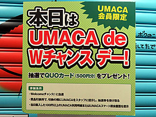 ちなみに今日の「 Welcomeチャンス!」は「 UMACA de Wチャンス」デーでしたが、残念ながら自分はハズレ… |