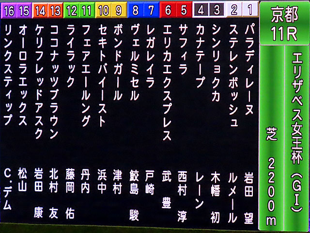そして京都11RはGⅠ エリザベス女王杯。芝2200m。 勝ったのは1番人気 レガレイラ。 スワーヴリチャード産駒の牝4で、鞍上は 戸崎圭太騎手。 ホープフルS、 有馬記念に続いてGⅠ3勝目。 |