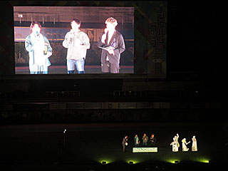 最終レース終了後、パドックで「 UMAJO MEETS HYPNOSISMIC -D.R.B- スペシャルトークショー」が行われました。 出演は声優の 野津山幸宏さん、 白井悠介さん、 竹内栄治さんとのこと。 声優ということで、昨年のジャパンカップを実況してみるといったチャレンジも。 |