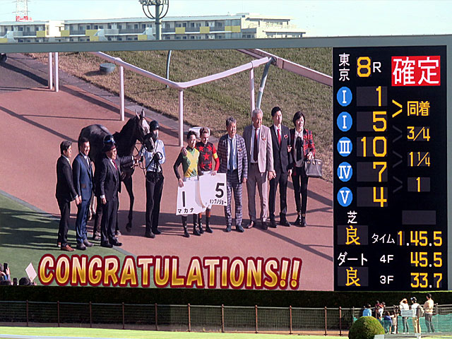 東京8Rは2勝クラスの芝1800m戦。 このレースで2番人気 マカナ、4番人気 キングノジョーが珍しい1着同着! 東京競馬場での1着同着は、4/26の7R以来で今年2度目。 ターフビジョンには 菅原明良騎手と A.プーシャンが並んで口取りをしている姿が映されていました。 |