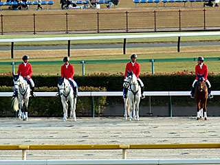 メインレースの 誘導馬。 今日は ハナビマンカイ、 タケルペガサス、 サクセスミノル、 マイネルラクリマが務めていました。 |