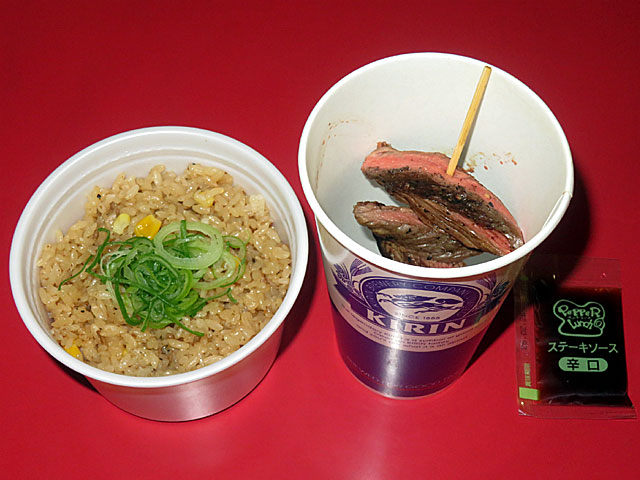 さらに フジビュースタンド3Fの 「ペッパーランチ」へ。 「 ペッパー杯」と「 ひとくちステーキスプリント」を注文。 ペッパー杯は カップDEペッパーライスの商品名を変えただけで全く同じもの。 また、 ひとくちステーキスプリントはステーキ重と同じ赤身肉約50gを串に刺したサイドメニュー。 ステーキ重なら100g=500円換算なのでちょっと割高かなぁ… |