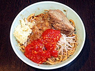 昼メシは 「俺の生きる道」へ。 新メニュー「 俺道トマト汁なし」を注文。 汁なしラーメンにトマトソースをかけたもの。 ワシワシ縮れ太麺に肉塊のチャーシューは相変わらずボリュームたっぷり! |
