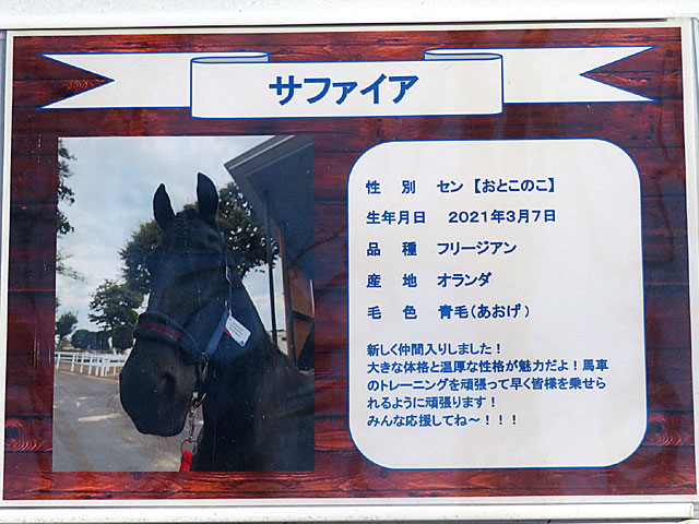 この時期にしては比較的暖かい1日となった パークウインズ東京競馬場。 まずは 乗馬の展示コーナーへ。 今日は ビーウルケ、 サファイア、 ペラの3頭が展示されていましたが、 サファイアという馬は新顔。 馬車用のフリージアン種とのこと。 |