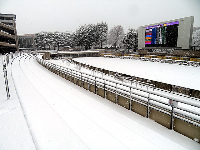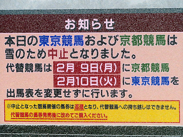 今日は昨晩から降り続いた雪の影響で、 東京競馬および 京都競馬は開催中止となりました。 また、同時開催の小倉競馬は障害4Rを中止とし、全体的に発走時刻を繰り下げて開催が行われました。 競馬開催が中止となるのは 昨年2/8の京都競馬以来、ちょうど1年ぶり。 なお、 先週から5億3990万5240円のキャリーオーバーが発生している WIN5は、さらに来週へ持ち越しとなっています。 |