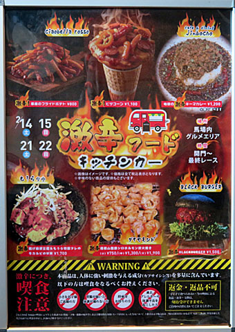 今週は2/10(火)に代替競馬があったので、中3日で再び競馬開催日。冬の東京開催3週目を迎え、今週からグルメエリアで「激辛グルメフェア」が始まりました。 出店していたのはいずれもキッチンカー屋台で「ダイヤモンド酒場」「ブラックバーガー」「もうら食堂」「jimbocho」「チャオベッラロッソ」の5軒。 せっかくなので「ダイヤモンド酒場」で「箱根山麓豚シロホルモン炭火焼き」1200円と、「チャオベッラロッソ」で「ローテッドポテト」1000円を購入。 どちらもおいしかったが、もうキッチンカー屋台ですら1000円以上が当たり前の時代なのかぁ…