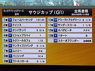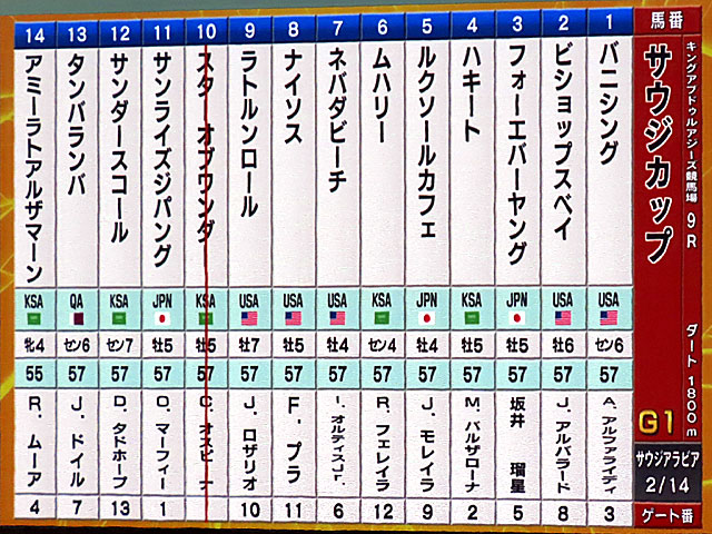 結果、G1サウジカップで世界のダート王者フォーエバーヤングが完勝! 史上初のサウジカップ連覇となり、一昨年にサウジダービーも制しているのでサウジ3連覇! GⅠJpnⅠは2023年全日空2歳優駿、2024年JDC、東京大賞典、2025年サウジC、BCクラシックに続き6勝目となりました! 次走のドバイワールドカップも楽しみ! なお、他レースの結果は以下の通り。 ■3R:G3 サウジダービー:ダート1600m └3着:サトノボヤージュ(戸崎圭太) └4着:ワンダーディーン(O.マーフィー) └5着:ケイアイアギト(J.モレイラ) └12着:トウカイマシェリ(鮫島克駿) ■5R:G2 リヤドダートスプリント:ダート1200m └4着:アメリカンステージ(坂井瑠星) └6着:ガビーズシスター(J.モレイラ) └7着:ドンアミティエ(R.ムーア) └12着:ヤマニンチェルキ(岩田望来) ■6R:G2 1351ターフスプリント:芝1351m └5着:パンジャタワー(J.モレイラ) └6着:フォーチュンタイム(坂井瑠星) └13着:シンフォーエバー(戸崎圭太) ■7R:G1 ネオムターフカップ:芝2100m └4着:シンエンペラー(坂井瑠星) └5着:ヤマニンブークリエ(横山典弘) └7着:アロヒアリイ(岩田望来) ■8R:G2 レッドシーターフハンデキャップ:芝3000m └8着:シュトルーヴェ(J.モレイラ) └11着:ヴェルミセル(M.バルザローナ) ■9R:G1 サウジカップ:ダート1800m └優勝:フォーエバーヤング(坂井瑠星) └5着:ルクソールカフェ(J.モレイラ) └6着:サンライズジパング(O.マーフィー) | ||||||||||||||||||||||||||||||||||||||||||||||||||||||||||||||||||||||||||||||||||||||||||||||||||||||||||||||||||||||||||||||||||||||||||||||||||||||||||||