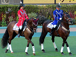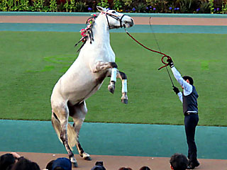 最終レース終了後、パドックで「 ホースダンスショー」が行われました。 演者は 昨年と同じく ドタードと カガンチョ。 |