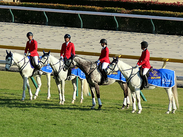 メインレースの 誘導馬。 今日は タケルペガサス、 サクセスミノル、 サトノソルタス、 ミライヘノツバサの4頭が務めていました。 |