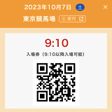 指定席/スマートシートは開門と同時に入場可能です。(開門時刻は通常9:00ですが開催日によって異なります) 入場券ネット予約は、予約時に入場可能時刻が指定されるため、それより早い時間に入場することはできません。 入場券の当日現地発売は、開催日によって発売開始時刻が異なるため、 JRA公式サイトでご確認ください。 また、開催日、チケットの種類、時間によって、入場可能な入場門が変わるため、当日、入場門等に掲示されている案内をご確認ください。 |